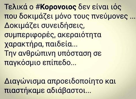 Ο κορωνοϊός μοιάζει με ένα (εκ πρώτης όψεως) απροειδοποίητο μεγάλο διαγώνισμα της Νέας Τάξης Πραγμάτων, μέσω του οποίου εξετάσθηκε ο καθένας από εμάς σε όποιο μέρος του πλανήτη κι αν βρισκόταν.